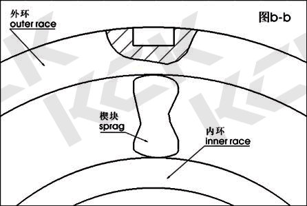 此型单向离合器的内环及外环均为圆柱形环面。楔块安置在保持器中来支撑内环与外环,依照楔块与内环、外环的相对运动来达到传递扭力或空转的功能。此种型式可设计出各种形式的楔块及保持器以满足各种不同的特性需求。其特点是传递矩扭矩大,使用寿命长。(如图b-b)。